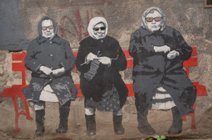 Thus, the idea arose to create a humorous artwork featuring the characters of three neighbors sitting on a bench, knitting, cracking sunflower seeds, and watching their surroundings—reminiscent of a time when there were neither cameras nor barriers, and the neighbors knew everything about everyone, and even more.