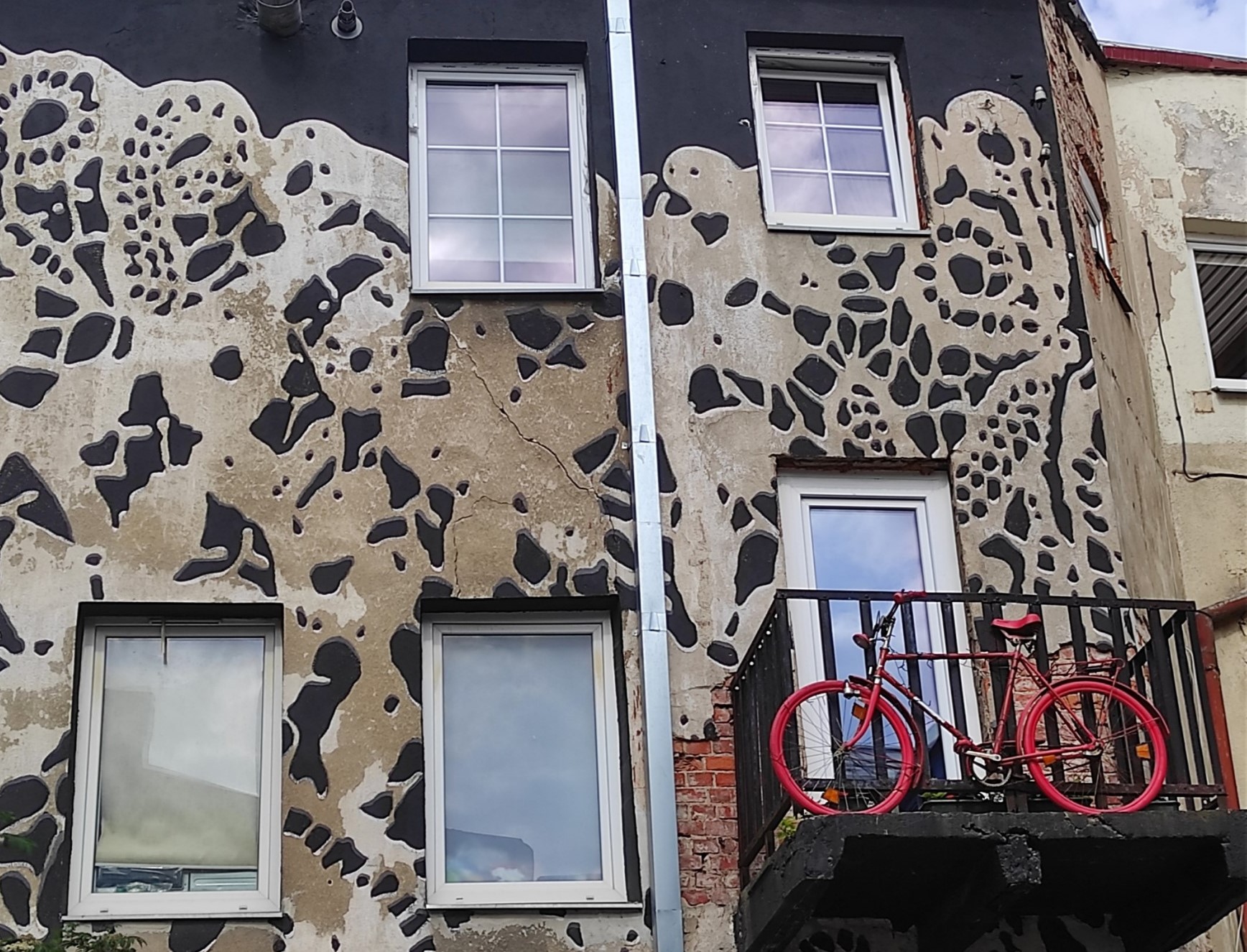 In 2018, the first stage of yard scenography was implemented—the Black House. By purposefully using the principle of contrast between achromatic colors and the layered plaster imitation typical of the sgraffito technique, a colorful, relief-like, floral knit-inspired design was created on the building’s facade. The Black House project aimed not only to showcase the neighbors’ hobbies, such as knitting or crocheting, but also to draw attention to the color palette of the house, which had never been painted before, and only became visible with the introduction of a black base.