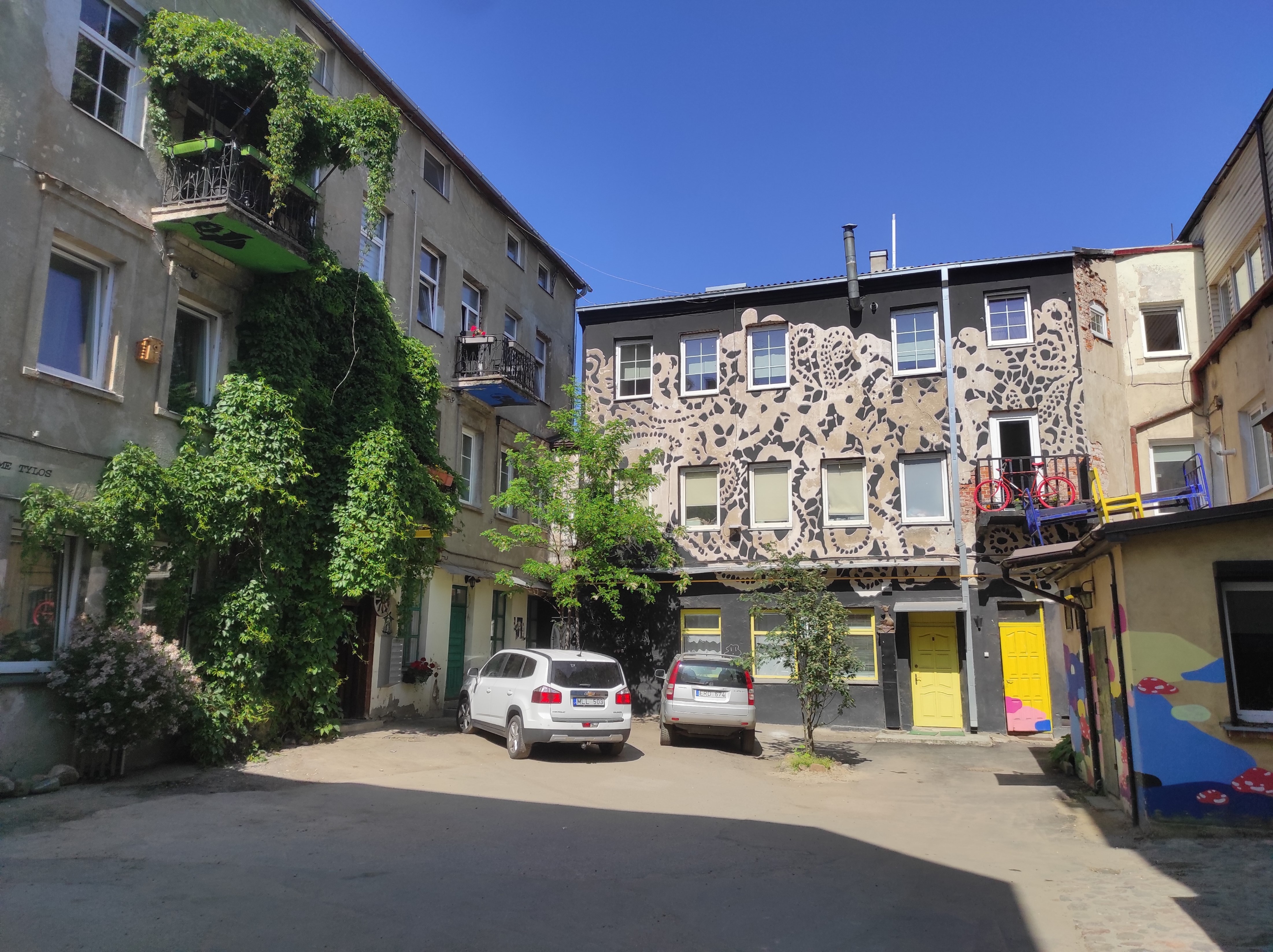 An important detail: The Yard Gallery adheres to the core principle that the “old colors of the buildings” are an integral part of our courtyard’s historical heritage. Only by introducing new, complementary colors do the old colors, as layers of past times, “come to life” again and reveal themselves in a different way. I play with cultural heritage, trying to preserve it authentically, and I consult with builders, for whom a newly plastered and painted wall is “correct.” I’m delighted when I manage to convince them that it is more beautiful with the marks of time, especially in a courtyard like ours, which is over 130 years old.