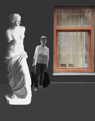 All the characters in the room are connected by the motif of the shadow, reflecting the profile of the “Venus de Milo” depicted at the center of the work. As a symbol of beauty, Venus was and probably still is the aspiration for women’s physical perfection—albeit without arms…