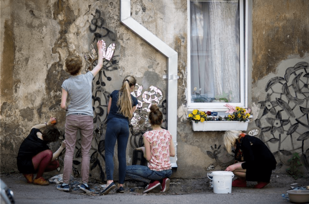In 2015, during the street art festival “Nykoka,” glass artist and co-author of the Yard Gallery, Ieva Voroneckytė, along with volunteers, helped plant mirrored flowers.