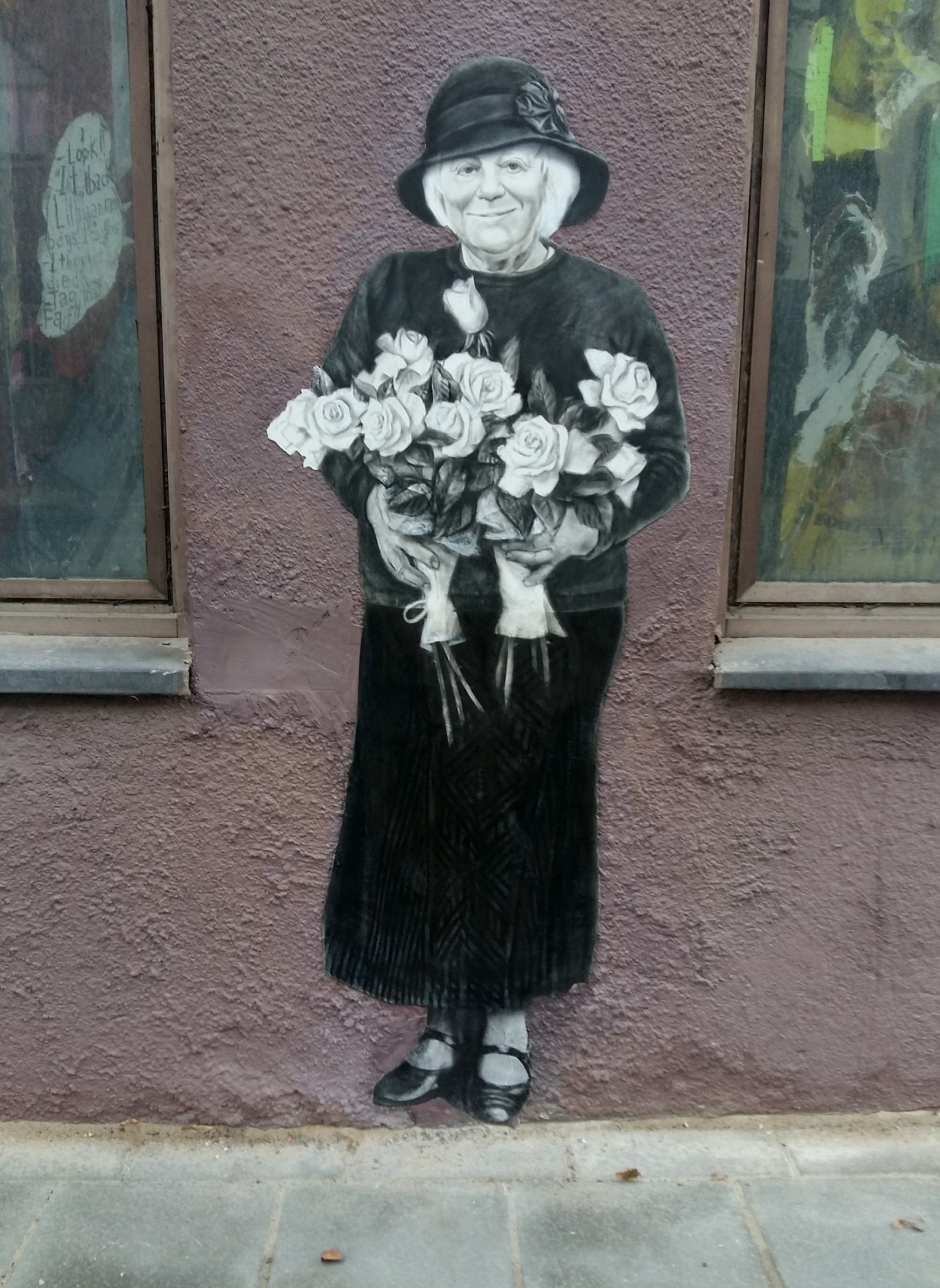 In 2018, a full-length painting of a woman with roses was created by the courtyard gates, commemorating the Dapkevičiūtė sisters, who lived in the yard during the post-war period and grew flowers.